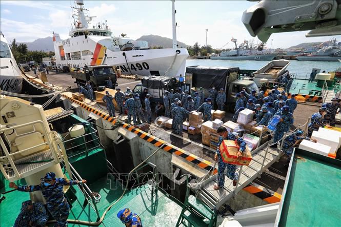 Những ngày đầu tháng 1 cũng là dịp những con tàu của Vùng 4 Hải quân và Chi đội Kiểm ngư số 4 thực hiện nhiệm vụ chở hàng hóa là nhu yếu phẩm phục vụ quân và dân trên huyện đảo Trường Sa, tỉnh Khánh Hòa để đón Tết Nguyên đán Tân Sửu.