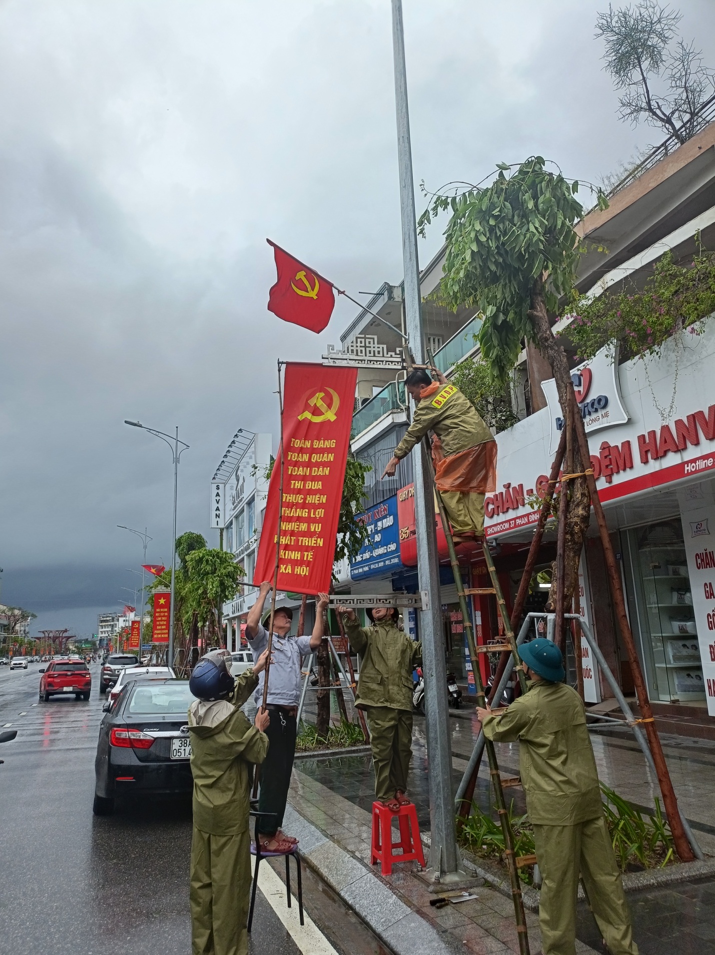Tranh thủ khi bão vừa dứt các lực lượng tranh thủ treo cờ, pa nô áp phíc