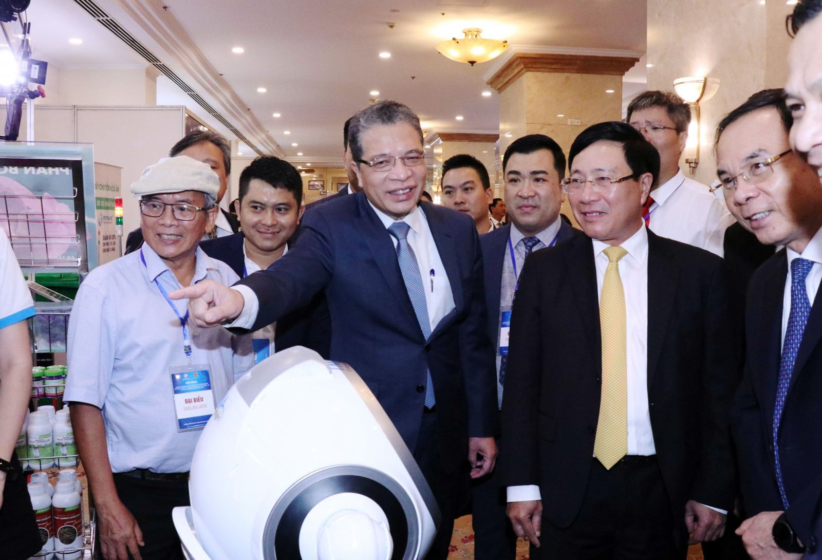 Ủy viên Bộ Chính trị, Phó Thủ tướng Chính phủ Phạm Bình Minh tham quan các sản phẩm công nghệ mới của doanh nghiệp kiều bào tại Hội nghị Kiều bào đóng góp ý kiến về chuyển đổi số và khắc phục tác động của đại dịch COVID-19 để phát triển kinh tế Việt Nam_Ảnh: TTXVN
