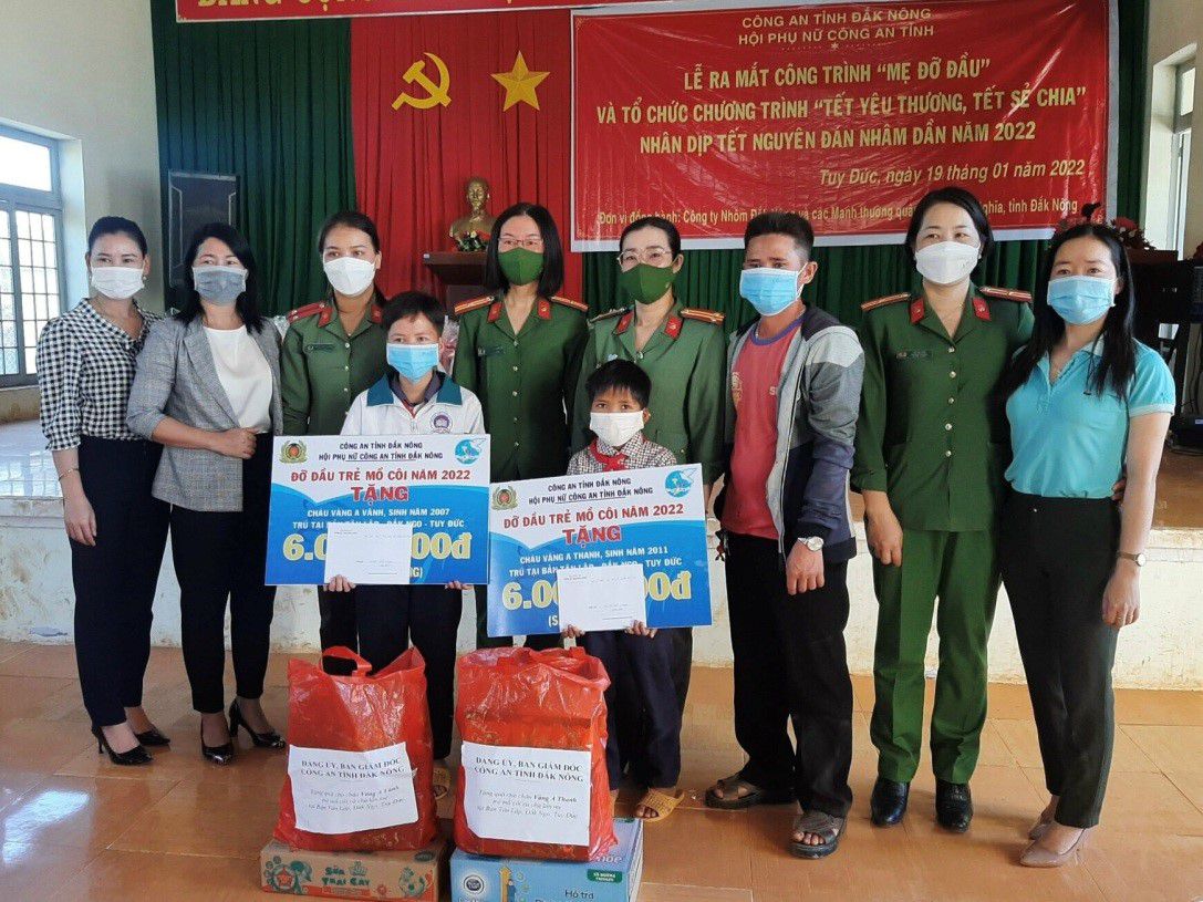 Dịp này, Hội Phụ nữ Công an tỉnh cũng đã tổ chức ra mắt mô hình “Mẹ đỡ đầu”, nhận đỡ đầu, chăm sóc 2 cháu nhỏ mồ côi cả cha lẫn mẹ là Giàng A Vành (SN 2007), và Giàng A Thanh (SN 2011), đều trú tại bản Tân Lập, xã Đắk Ngo, huyện Tuy Đức. Kinh phí nhận đỡ đầu chăm sóc hỗ trợ cho hai cháu là 1 triệu đồng/1 tháng, do các hội viên Hội Phụ nữ Công an tỉnh tự nguyện đóng góp. Đây là hai anh em ruột, mẹ mất vì bệnh hiểm nghèo năm 2019, bố mất vì tai nạn giao thông năm 2021, hiện đang ở với cậu và có hoàn cảnh kinh tế gia đình hết sức khó khăn.... với mong muốn mang đến cho các em nhỏ mồ côi một cái Tết đầy đủ, ấm áp hơn lan tỏa tình yêu thương và tiếp thêm niềm tin, động lực để các em tiếp tục nỗ lực phấn đấu, vươn lên trong cuộc sống..