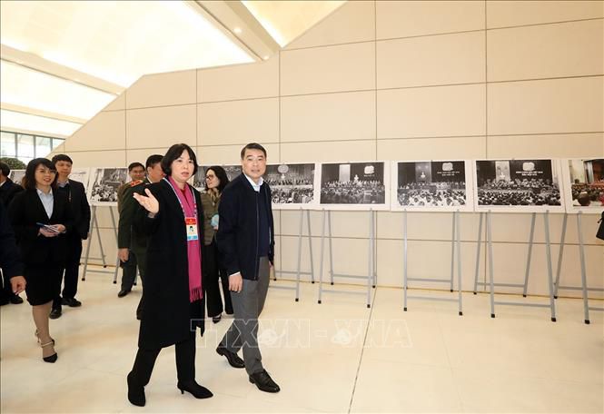 Phó Tổng Giám đốc Thông tấn xã Việt Nam Vũ Việt Trang giới thiệu với đoàn công tác khu trưng bày ảnh của Thông tấn xã Việt Nam tại đại hội.