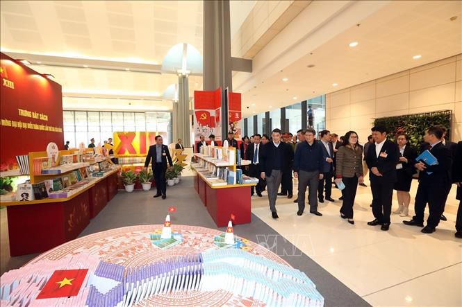 Đồng chí Lê Minh Hưng, Ủy viên Trung ương Đảng, Chánh Văn phòng Trung ương Đảng kiểm tra khu trưng bày sách tại đại hội.