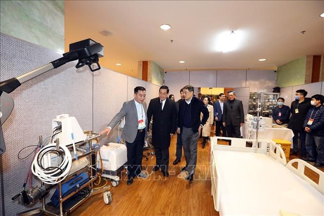 Đồng chí Lê Minh Hưng, Ủy viên Trung ương Đảng, Chánh Văn phòng Trung ương Đảng kiểm tra công tác chuẩn bị y tế tại đại hội.