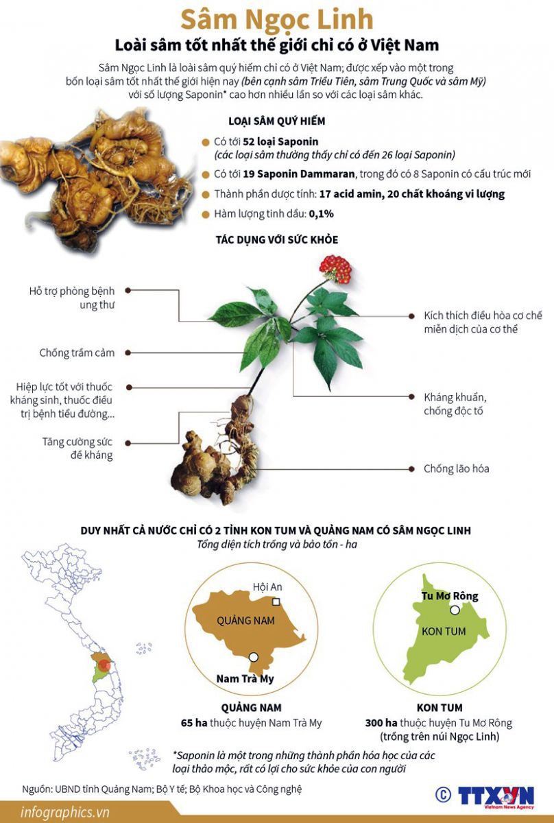 Sâm Ngọc Linh được gọi là "Quốc bảo" của Việt Nam, được phân bố ở khu vực rừng núi cao ở Kon Tum và Quảng Nam. Tại KonTum, huyện Đắk Tô là cửa ngõ trước khi đi lên vùng núi Ngọc Linh - nơi đây được xem là thủ phủ của sâm Ngọc Linh Kon Tum. Sâm Ngọc Linh rất có giá trị, mỗi ký có giá từ hàng chục đến cả trăm triệu đồng (tùy loại).