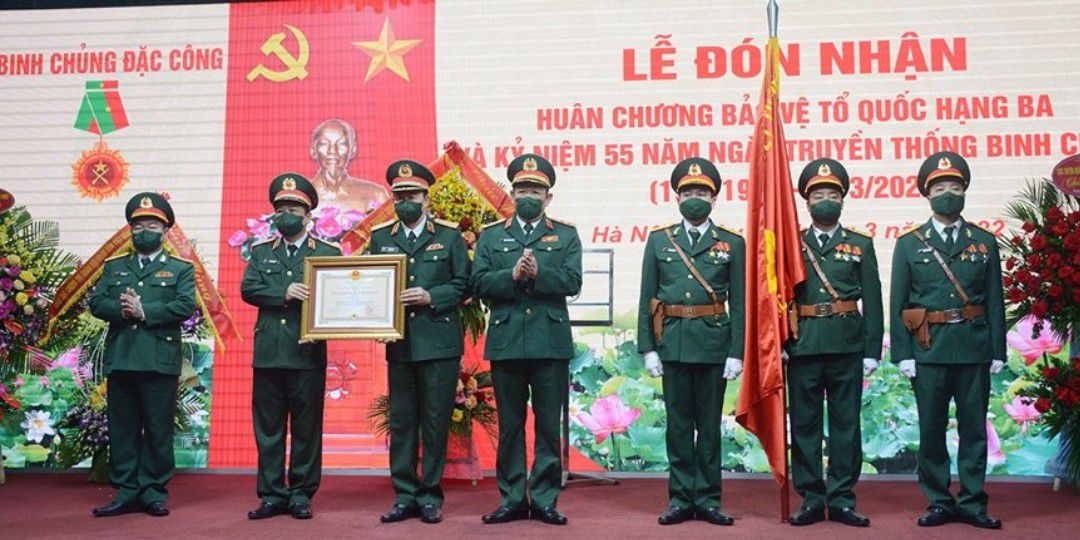 Ngày 18/3/2022 tại Hà Nội, Binh chủng Đặc công tổ chức Lễ đón nhận Huân chương Bảo vệ Tổ quốc hạng Ba và kỷ niệm 55 năm Ngày truyền thống Binh chủng (19/3/1967-19/3/2022). Đây vừa là niềm vui, niềm phấn khởi, tự hào của tất cả cán bộ, chiến sĩ Binh chủng Đặc công đồng thời cũng là sự ghi nhận, động viên, khích lệ tinh thần kịp thời của Đảng, Nhà nước, Chính phủ và nhân dân với sự trưởng thành, phát triển của đơn vị.