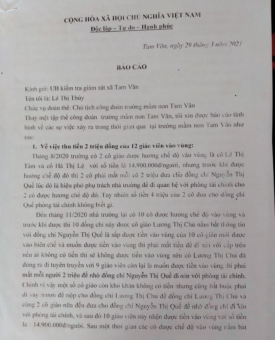 Trước đó vào ngày 29/3/2021, Ủy ban Kiểm tra Đảng ủy xã Tam Văn đã nhận được báo cáo về các sự việc được cho là sai phạm của bà Nguyễn Thị Quế, Hiệu trưởng Trường Mầm non Tam Văn từ phía bà Lê Thị Thúy, Chủ tịch Công đoàn nhà trường như: Lấy lý do đi quan hệ với Phòng Tài chính Kế hoạch huyện để thu tiền vào vùng của 12 giáo viên (mỗi giáo viên phải đóng 2 triệu đồng); làm đủ ngày công để được hưởng nguyên lương, sau đó thu tiền lương của 2 giáo viên vừa được vào biên chế số tiền 15.520.000đ, khi họ nghỉ hưởng chế độ thai sản nhưng chưa đủ thời gian làm việc 6 tháng để được hưởng chế độ theo quy định; thống nhất thu tiền mua sắm bổ sung đồ dùng bán trú năm học 2020-2021 là 450.000đ/cháu, nhưng sau đó lại tuyên truyền phụ huynh học sinh tự nộp tiền đi mua giường ngủ cho con trẻ. Trong khi đó số tiền thu mua bổ sung đồ dùng bán trú 450.000đ/cháu đã không được mua sắm kịp thời, khiến một số cháu phải mang chăn từ nhà lên trường để đắp; thu tiền của giáo viên tham gia hội thi “Giáo viên giỏi cấp huyện”; không đóng tiền đảng phí từ 4/2020 - 3/2021 và có ý định lấy thêm tiền Đảng phí của Đảng viên đã nộp về để sử dụng cho riêng mình; tạo nhóm, chia rẽ nội bộ, gây mất đoàn kết trong tập thể giáo viên nhà trường, khiến họ mất niềm tin vào sự lãnh đạo của Hiệu trưởng, dẫn đến không yên tâm tư tưởng để công tác.