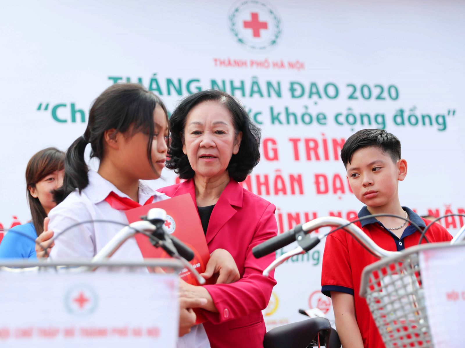Ủy viên Bộ Chính trị, Trưởng Ban Dân vận Trung ương Trương Thị Mai trao xe đạp và học bổng cho các em học sinh, sinh viên có hoàn cảnh khó khăn vươn lên trong học tập_Ảnh: TTXVN