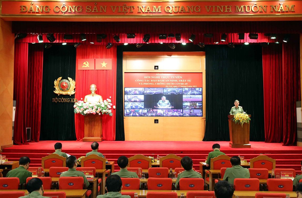 Ngày 17/8/2021, tại Hà Nội, Bộ Công an tổ chức Hội nghị trực tuyến đến Công an các đơn vị, địa phương để chỉ đạo về công tác bảo đảm an ninh, trật tự (ANTT), phòng, chống dịch Covid-19 và phát động phong trào thi đua đặc biệt trong lực lượng Công an nhân dân (CAND) hưởng ứng phong trào thi đua đặc biệt “Cả nước đoàn kết, chung sức, đồng lòng thi đua phòng, chống và chiến thắng đại dịch Covid-19” do Thủ tướng Chính phủ phát động. Đại tướng Tô Lâm, Ủy viên Bộ Chính trị, Bộ trưởng Bộ Công an chủ trì Hội nghị.