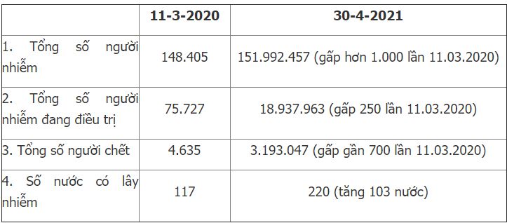 Ngày 11-3-2020, Tổ chức Y tế thế giới (WHO) xác nhận lây nhiễm Covid-19 trên thế giới đã trở thành đại dịch toàn cầu. Từ đó đến nay (30-4-2021) đã qua một năm và 50 ngày. Trạng thái dịch toàn thế giới đã thay đổi rất lớn, theo hướng xấu đi, vẫn chưa kiểm soát và giảm lây nhiễm được (bảng 1).