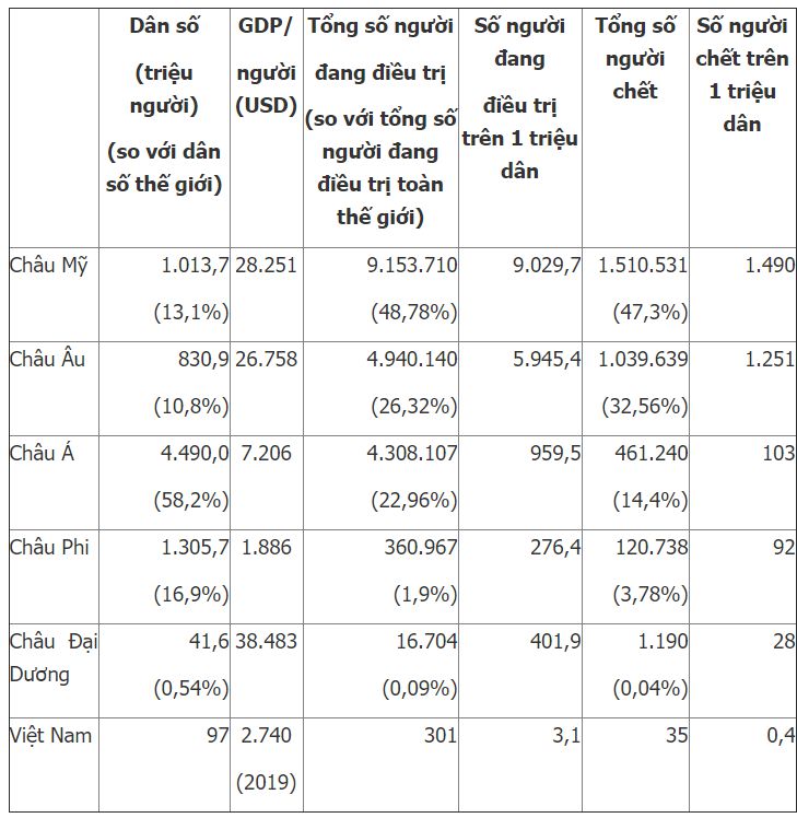 Qua thống kê ở bảng 2 cho thấy, với tiêu chí số người người đang điều trị/1 triệu dân và số người chết/1 triệu dân thì tình hình dịch hiện nay ở châu Mỹ và châu Âu là nặng nhất trên thế giới, tiếp theo là châu Á và châu Phi. Đáng lưu ý là GDP/người của châu Mỹ và châu Âu cao hơn nhiều lần châu Á và châu Phi, song cường độ lây nhiễm (số người đang điều trị/1 triệu dân) của châu Mỹ và châu Âu cũng gấp nhiều lần châu Á và châu Phi.