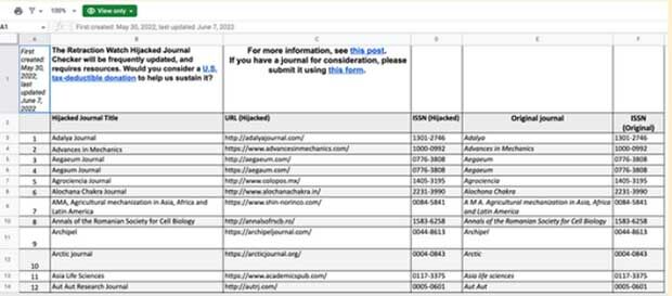 Danh mục cảnh báo tạp chí mạo danh của Retraction Watch được tạo ra từ sự hợp tác giữa trang tin này với TS Anna Abalkina, chuyên gia nghiên cứu về liêm chính khoa học tại Đại học Tự do Berlin (Freie Universität Berlin).