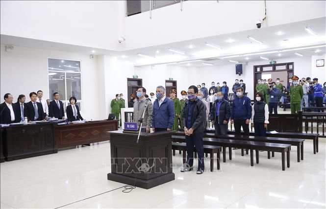Bị cáo Vũ Huy Hoàng và đồng phạm tại phiên tòa sáng 7-1-2021. Ảnh: Doãn Tấn/TTXVN