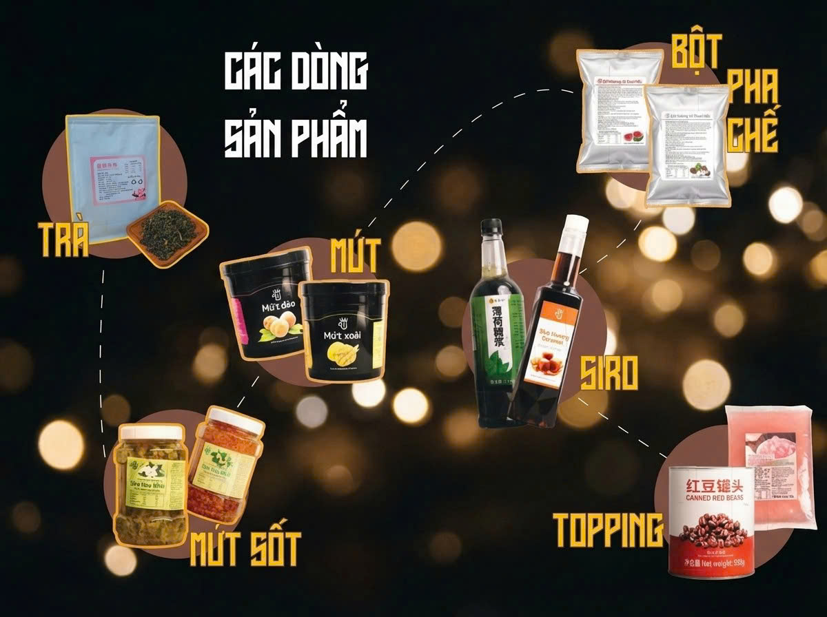 Topping: Đa dạng các loại thạch dừa, đậu đỏ, trân châu đen và trân châu trắng 3Q. Máy móc & Thiết bị: Cung cấp các công cụ thiết yếu như máy làm đá, máy dập nắp cốc, máy xay sinh tố và bình ủ trà. Mọi sản phẩm đều được lựa chọn kỹ lưỡng nhằm đảm bảo chất lượng tốt nhất cho khách hàng.