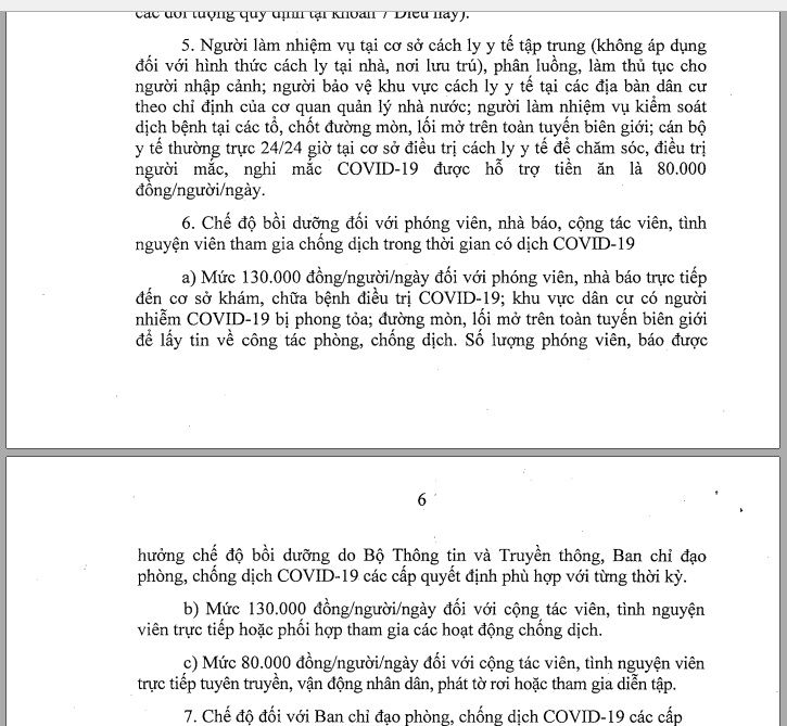Theo đó, chế độ bồi dưỡng đối với phóng viên, nhà báo, cộng tác viên, tình nguyện viên tham gia chống dịch trong thời gian có dịch Covid-19. Cụ thể như sau: