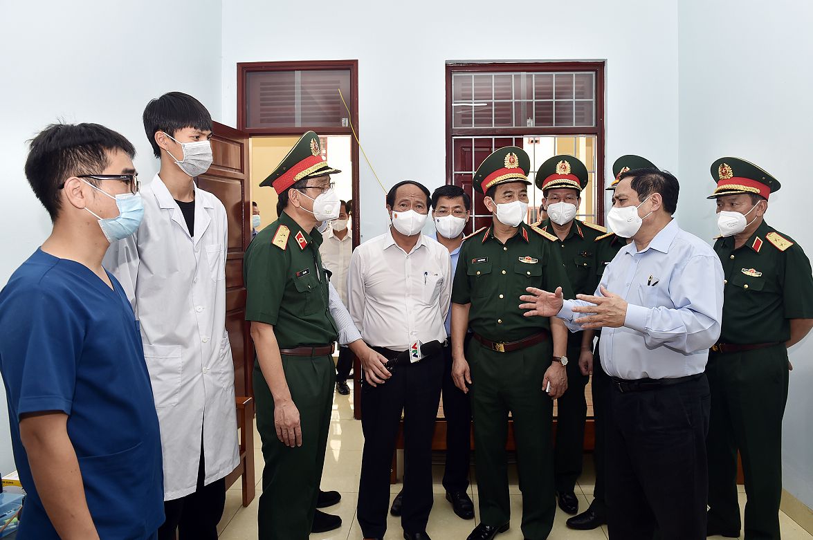 Thủ tướng Phạm Minh Chính động viên đội ngũ nhân viên y tế Trung tâm nhiệt đới Việt - Nga đang chống dịch tại Bắc Giang. Ảnh VGP/Nhật Bắc