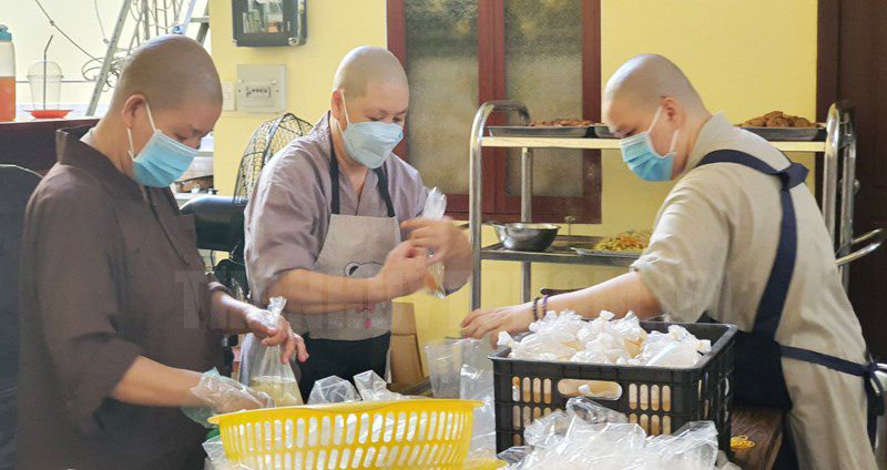 Các nữ tu chùa Diệu Pháp đang chuẩn bị những suất cơm hỗ trợ người dân khó khăn.
