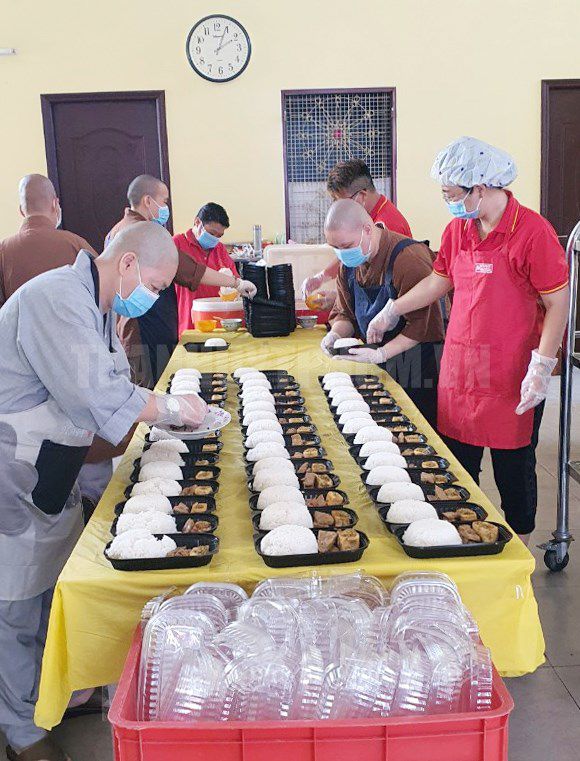 Để trong buổi sáng có những suất cơm nghĩa tình thì các nữ tu đã dậy từ 3 giờ sáng để chuẩn bị. Do dịch bệnh phức tạp, phải thực hiện giãn cách xã hội, không được tập trung đông người nên chùa Diệu Pháp không thể huy động cùng lúc nhiều phật tử. Vì vậy, bản thân sư trụ trì và các sư cô đều trực tiếp tham gia nấu các suất ăn. Mỗi người một việc, người lặt và rửa rau, người nấu cơm, người xào rau rồi chiên chả, người thì kho trứng, nấu canh, người vô hộp, người cột bịch…, ai cũng thoăn thoắt tay chân để kịp 10 giờ chuyển đi các nơi để phát đến tận tay người dân trong các khu vực cách ly, phong tỏa và ở các chốt trực của lực lượng tuyến đầu phòng, chống dịch.