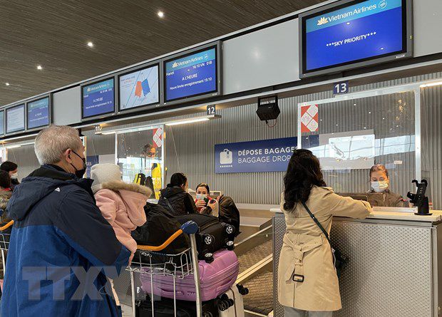 Hành khách làm thủ tục ngày 25/1 tại sân bay Charles de Gaulle để lên chuyến bay VN18 trở về Hà Nội. (Ảnh: TTXVN)