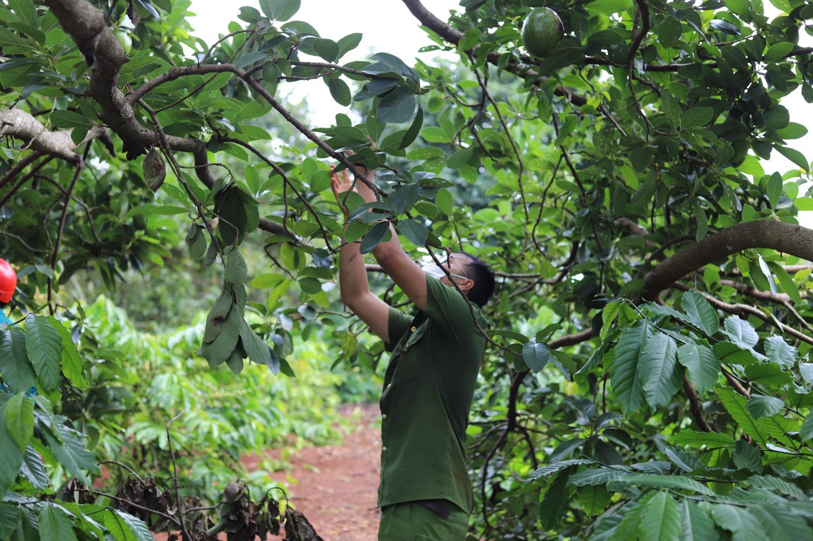 Lực lượng Công an huyện thu hái bơ của gia đình ông Thái.