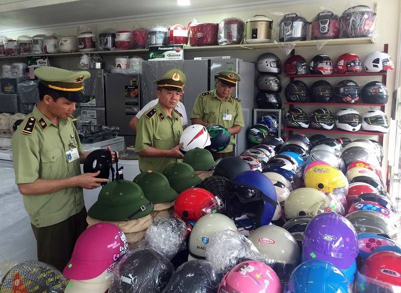 Đội QLTT số 8 Quảng Ninh kiểm tra mặt hàng mũ bảo hiểm – Ảnh: Tuấn Hương/ Báo QN