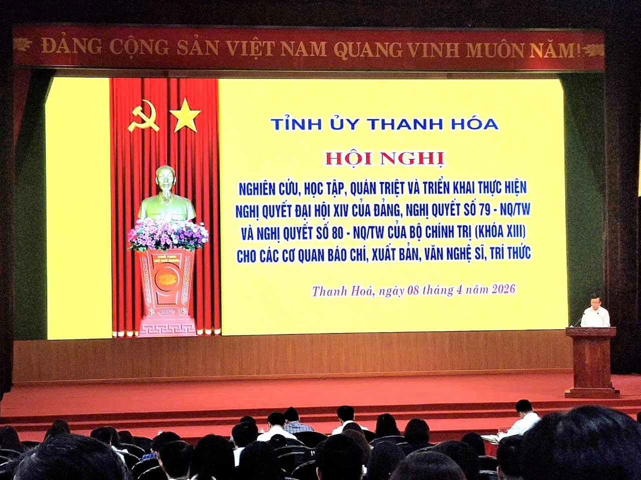 Tại điểm cầu Thanh Hóa, tham dự hội nghị có các đồng chí: Nguyễn Hồng Phong, Ủy viên dự khuyết Trung ương Đảng, Phó Bí thư Thường trực Tỉnh ủy, Chủ tịch HĐND tỉnh; Đào Xuân Yên, Ủy viên Ban Thường vụ, Trưởng Ban Tuyên giáo và Dân vận Tỉnh ủy; cùng lãnh đạo các ban, sở, ngành cấp tỉnh, cơ quan báo chí, xuất bản, đội ngũ văn nghệ sĩ và trí thức trên địa bàn.
