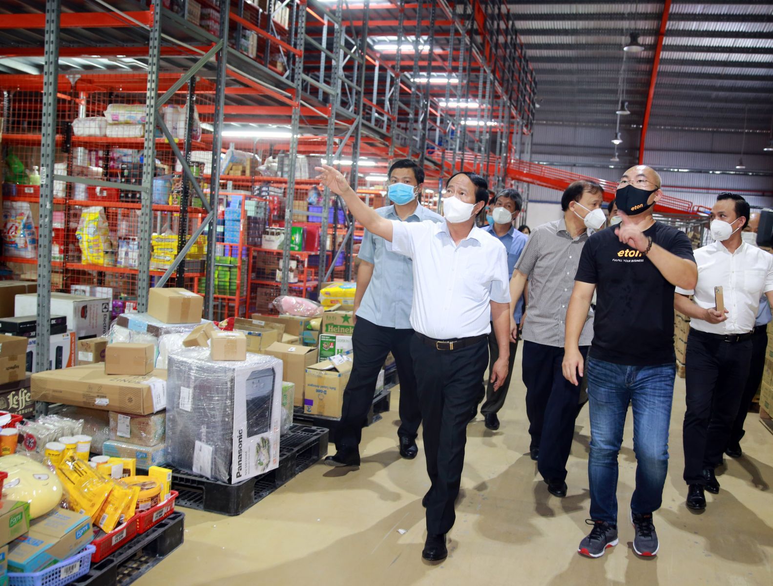 Phó Thủ tướng kiểm tra kho hàng dự trữ cho hệ thống siêu thị Vinmart tại phường Phú Thuận, Quận 7 cung ứng cho toàn bộ 300 cửa hàng tại TPHCM - Ảnh VGP/Đức Tuân
