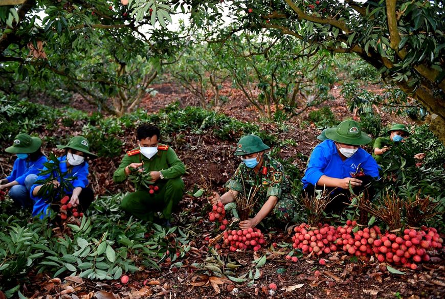Cán bộ, chiến sĩ LLVT giúp nhân dân thu hoạch vải thiều tại Lục Ngạn, Bắc Giang. Ảnh: qdnd.vn