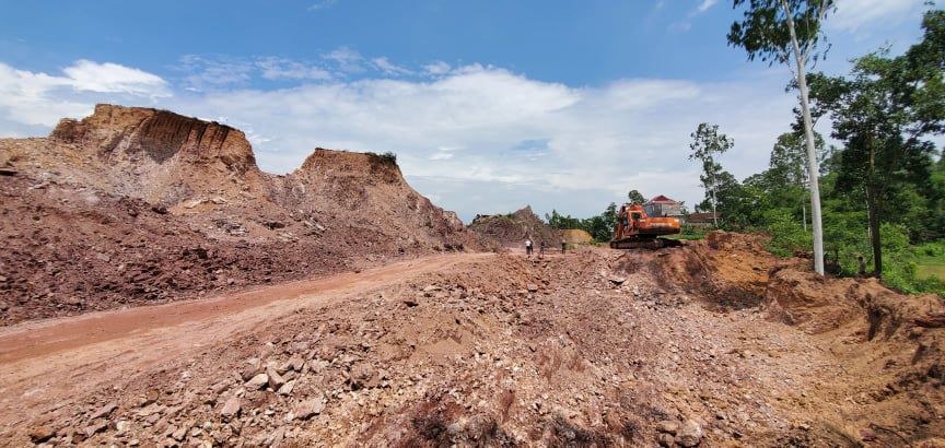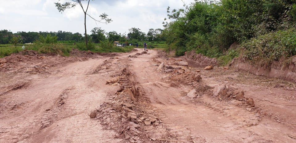 Con đường đi vào khu vực khai thác đất “chui” bị cày xới, in hằn sâu những vệt bánh xe.