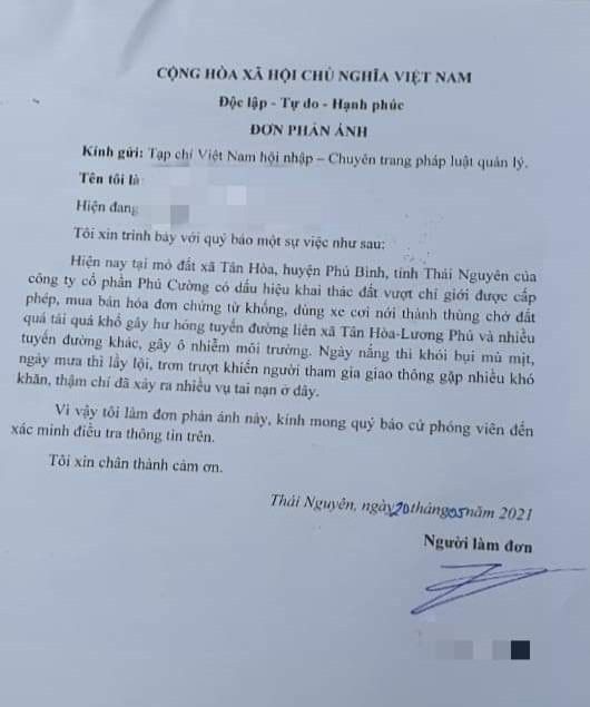 Đơn phản ánh của người dân gửi đến Tòa soạn Việt Nam Hội Nhập.