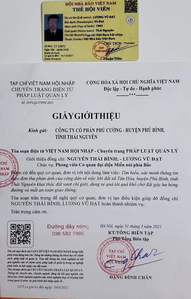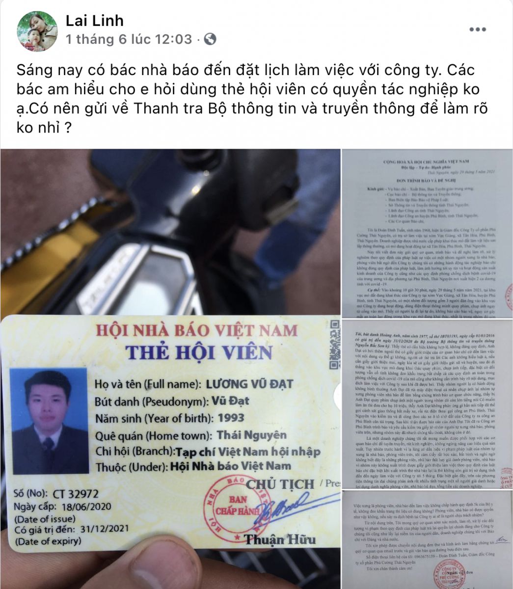 Chưa hết, vào khoảng 12h ngày 01/06/2021, chủ tài khoản facebook có tên “Lai Linh” lại tiếp tục cố tình đăng Thẻ hội viên hội nhà báo của phóng viên Tạp chí Việt Nam hội nhập (Không đăng kèm theo giấy giới thiệu mà trước đó phóng viên đã cung cấp để đặt lịch làm việc với Công ty Cổ phần Phú Cường) lên trang facebook “TIN NÓNG THÁI NGUYÊN”, với nội dung “Sáng nay có bác nhà báo đến đặt lịch làm việc với công ty. Các bác am hiểu cho e hỏi dùng thẻ hội viên có quyền tác nghiệp ko ạ. Có nên gửi về Thanh tra Bộ thông tin và truyền thông để làm rõ ko nhỉ ?”. Đây là lời vu khống vô căn cứ, trước đó phóng viên đã đến liên hệ đặt lịch làm việc theo đúng quy định, cung cấp giấy giới thiệu của tòa soạn và thẻ hội viên để minh chứng phóng viên là người được toà soạn cử đến.