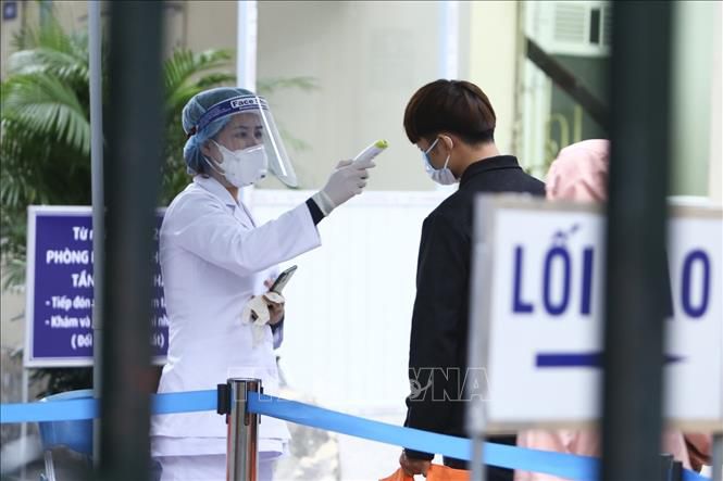 Người vào bệnh viện ở Hà Nội sẽ được kiểm tra thân nhiệt và khai báo lịch trình di chuyển (Ảnh: TTXVN)