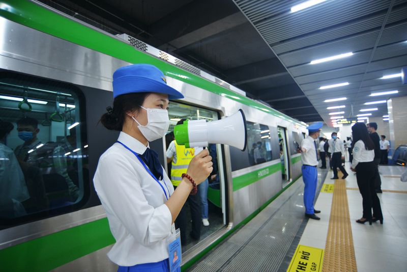 Tất cả các hành khách đi tàu Cát Linh-Hà Đông đều được đo thân nhiệt và rửa tay sát khuẩn bên ngoài sảnh trước khi vào ga. Khi vào đây, mặc dù người dân đều đeo khẩu trang, nhưng khoảng cách theo khuyến cáo 5K của Bộ Y tế không được đảm bảo do quá đông đúc. Bên trong các toa tàu, hầu như không có chỗ đứng trống.