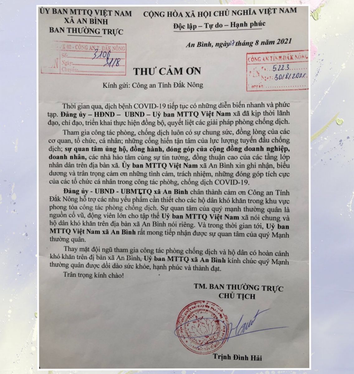 Thư cảm ơn của Ban Thường trực Ủy ban Mặt trận Tổ quốc Việt Nam xã An Bình gửi CBCS Công an tỉnh Đắk Nông.