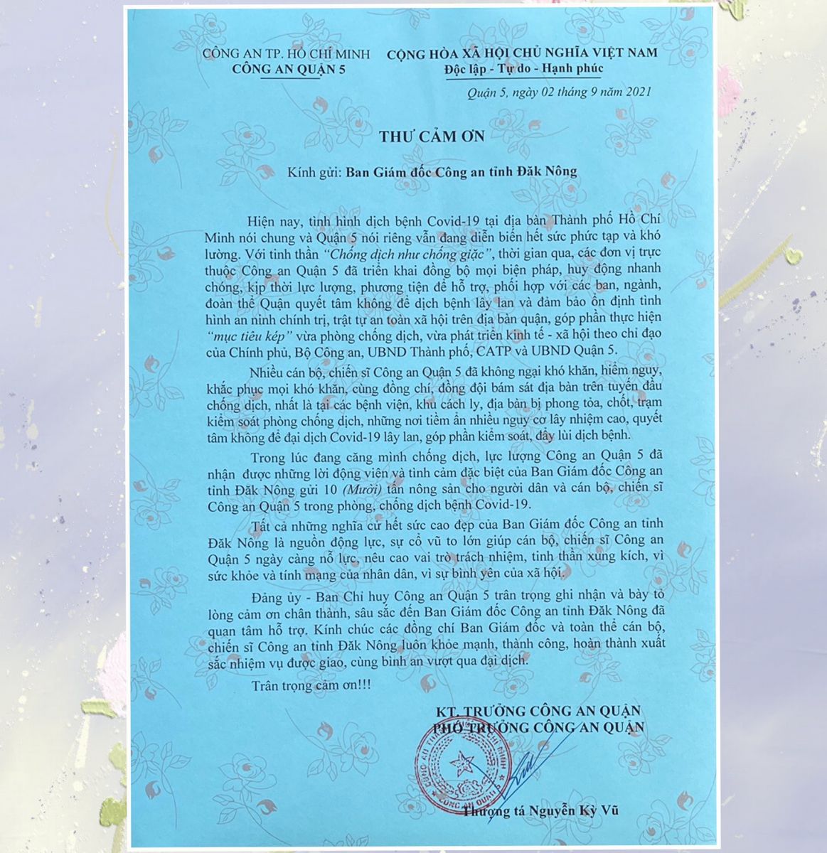 Nội dung bức thư có đoạn viết “Trong lúc đang căng mình chống dịch, lực lượng Công an Quận 5 đã nhận được những lời động viên và tình cảm đặc biệt của Ban Giám đốc và toàn thể cán bộ, chiến sĩ Công an tỉnh Đắk Nông gửi gắm qua những tấn nông sản thắm đượm nghĩa tình, đã để lại ấn tượng sâu đậm và lòng biết ơn sâu sắc trong lòng cán bộ, chiến sĩ và Nhân dân Quận 5. Tất cả những nghĩa cử hết sức cao đẹp của lãnh đạo, cán bộ, chiến sĩ Công an Đắk Nông là nguồn động viên, động lực, sự cổ vũ to lớn giúp cán bộ, chiến sĩ Công an Quận 5 ngày càng nỗ lực, nêu cao vai trò trách nhiệm, tinh thần xung kích, vì sức khỏe, tính mạng của Nhân dân, vì sự bình yên của xã hội. Đảng ủy, Ban Chỉ huy Công an Quận 5 trân trọng ghi nhận và bày tỏ lòng cảm ơn chân thành, sâu sắc tới Ban Giám đốc và toàn thể cán bộ, chiến sĩ Công an tỉnh Đắk Nông đã quan tâm, hỗ trợ, chia sẻ...”.