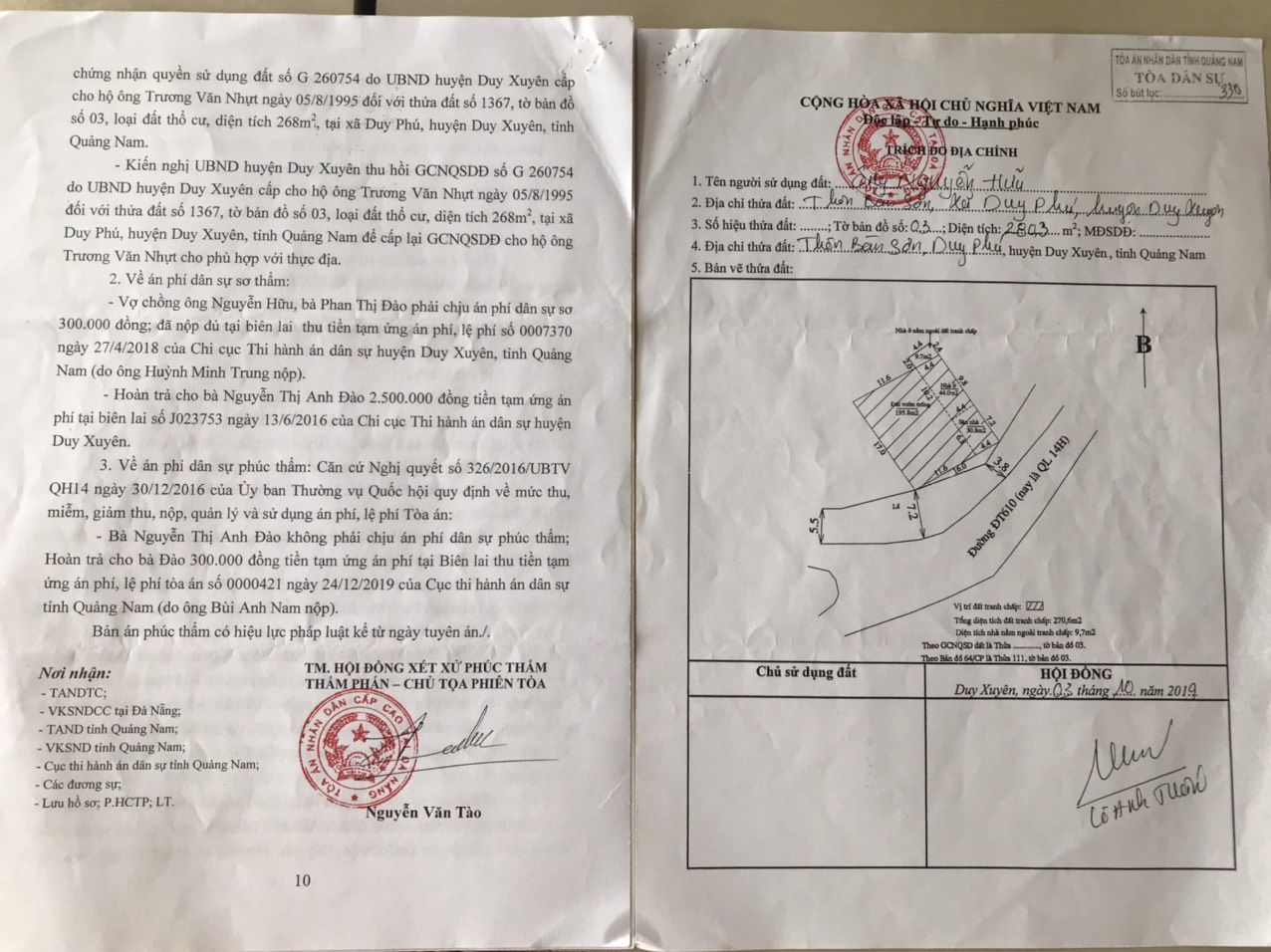 Bản án phúc thẩm nhận định: Không ảnh hưởng gì đến quyền và lợi ích hợp pháp của ông Nguyễn Hữu và bà Phan Thị Đào, nên ông Hữu và bà Đào không có quyền khởi kiện là không đúng pháp luật. Vì: Toàn bộ diện tích 268m2 tranh chấp tại xã Duy Phú, huyện Duy Xuyên theo thực tế hiện nay do ông Nguyễn Hữu và bà Phan Thị Đào quản lý sử dụng, trên đất tranh chấp có ngôi nhà cấp 4 ( kể cả bản án phúc thẩm cũng để tồn tại ngôi nhà) phần diện tích còn lại vợ chồng ông có công bồi túc ra mảnh đất như hiện nay nhưng chưa được giải quyết.