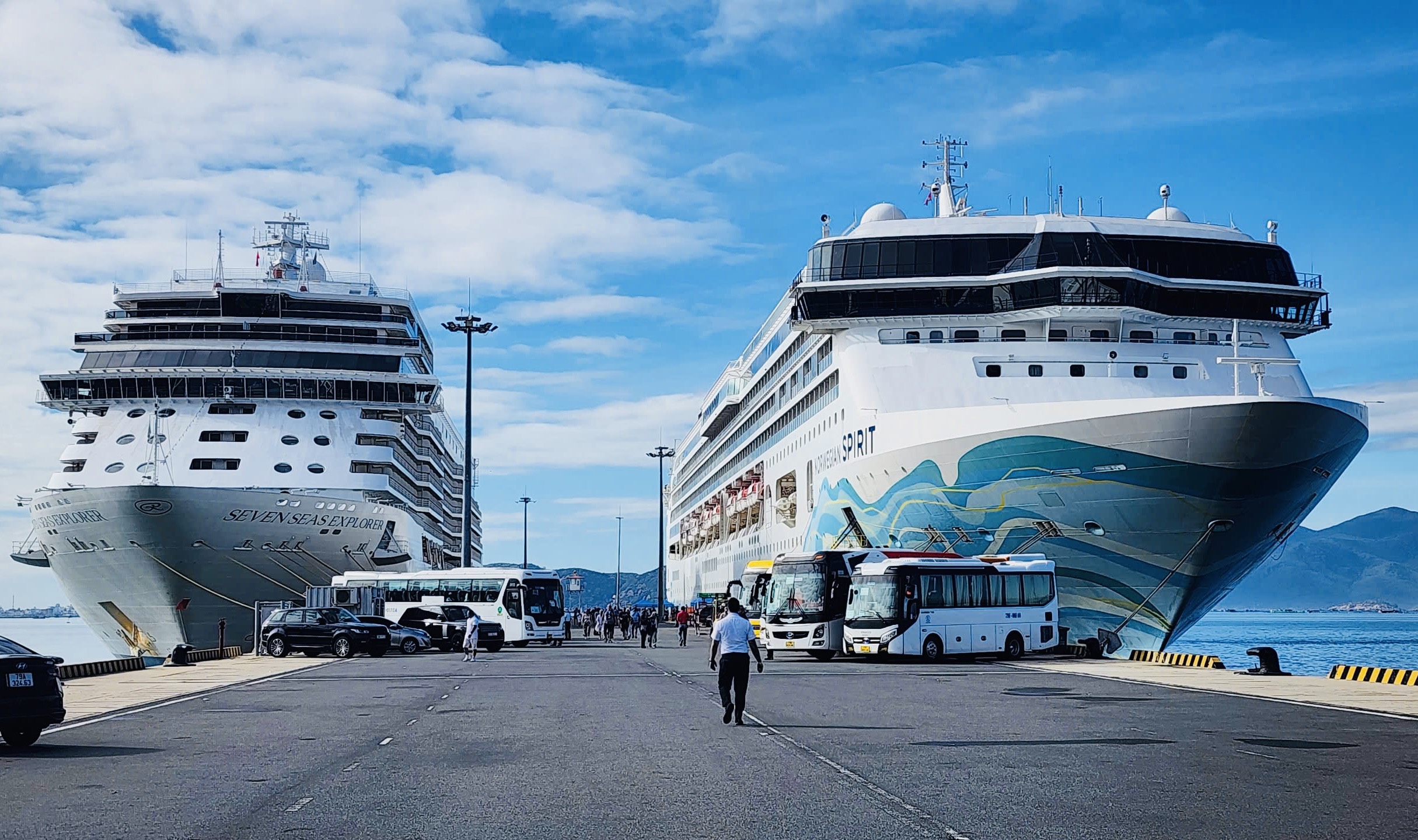 Tàu Norwegian Spirit và tàu Seven Seas Explorer cùng cập Cảng Quốc tế Cam Ranh vào sáng 14/2/2025. Ảnh: Báo Khánh Hòa
