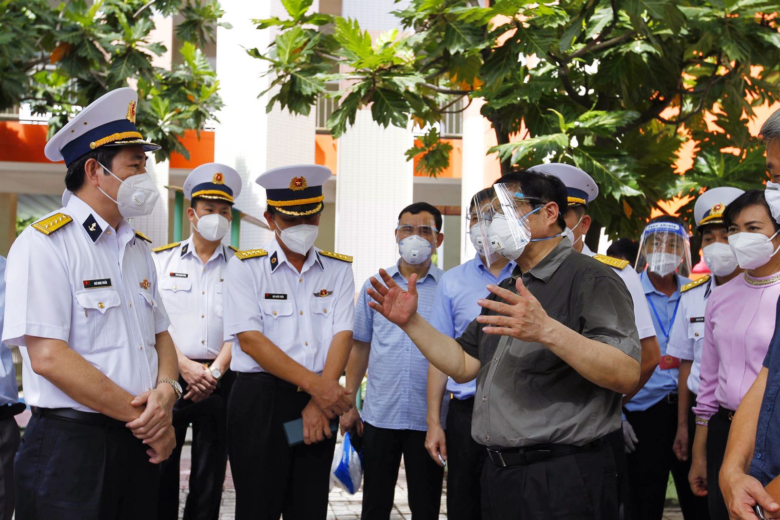 Ủy viên Bộ Chính trị, Thủ tướng Chính phủ Phạm Minh Chính kiểm tra công tác theo dõi, điều trị tại khu cách ly người lao động của Tân cảng Sài Gòn tại Trường mầm non Sơn Ca, thành phố Thủ Đức, Thành phố Hồ Chí Minh - Ảnh: TTXVN