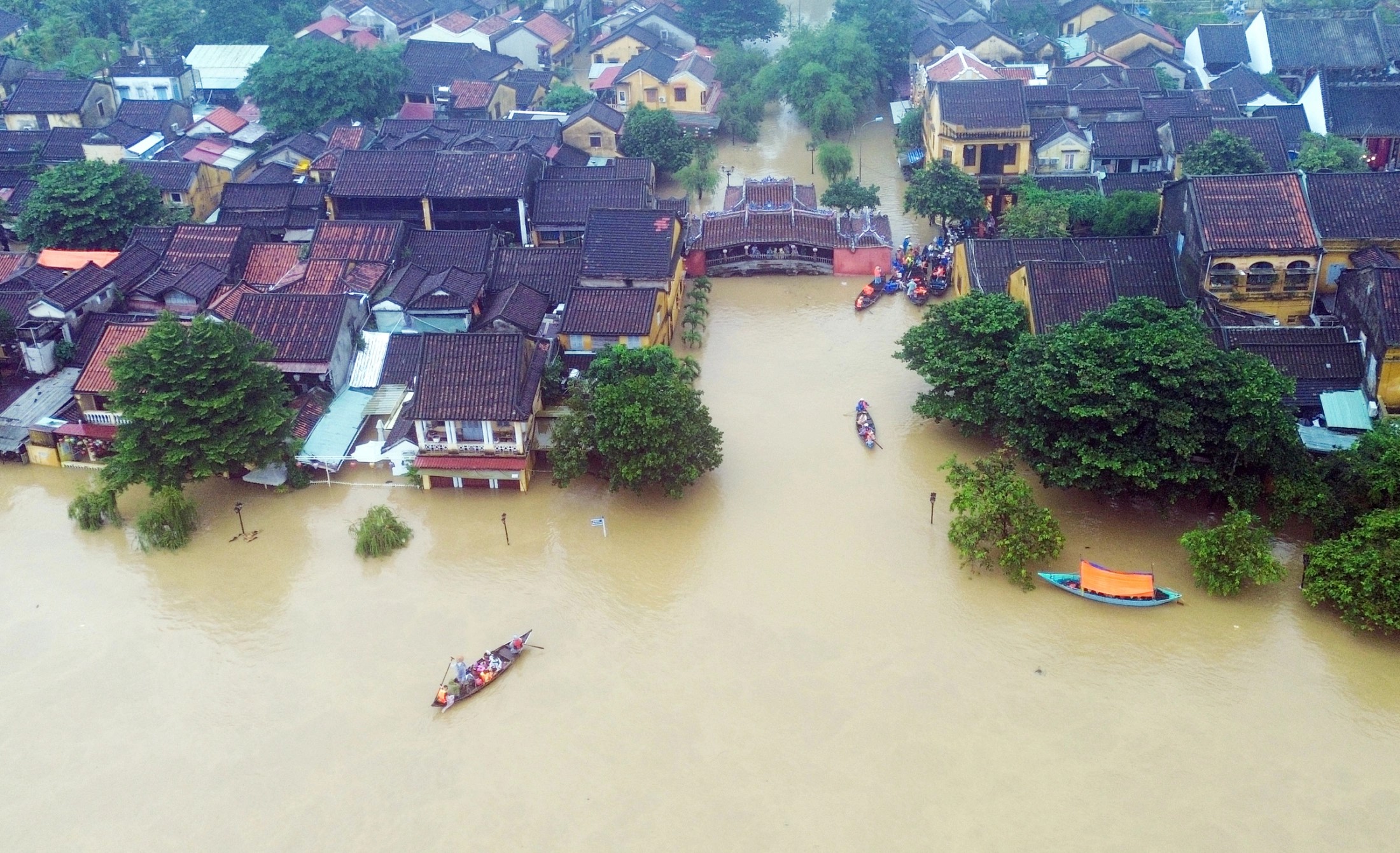 Hơn 15h ngày 27/10, Hội An mưa to, lũ dâng nhanh. Cầu An Hội nằm giữa sông Hoài chỉ còn nhô lên phần trụ. Đường Bạch Đằng và đường Nguyễn Phúc Chu ven sông ngập gần 2 m. Ảnh: VNE