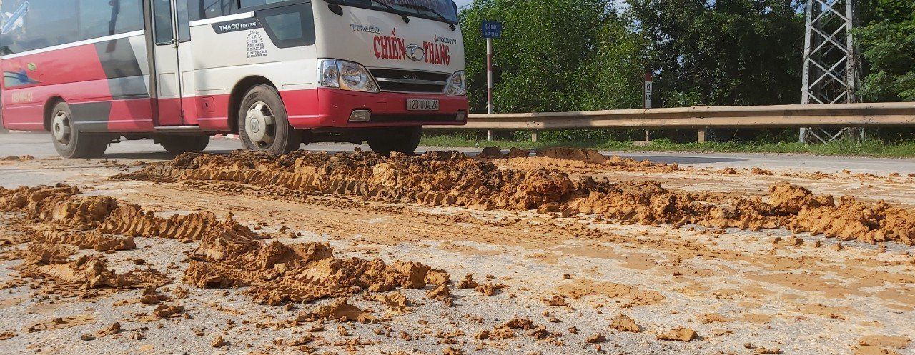 Xe chở đất không che chắn để rơi vãi ra cả đống đất ở đường quốc lộ 37, nguy cơ gây mất ATGT cho người đi đường.