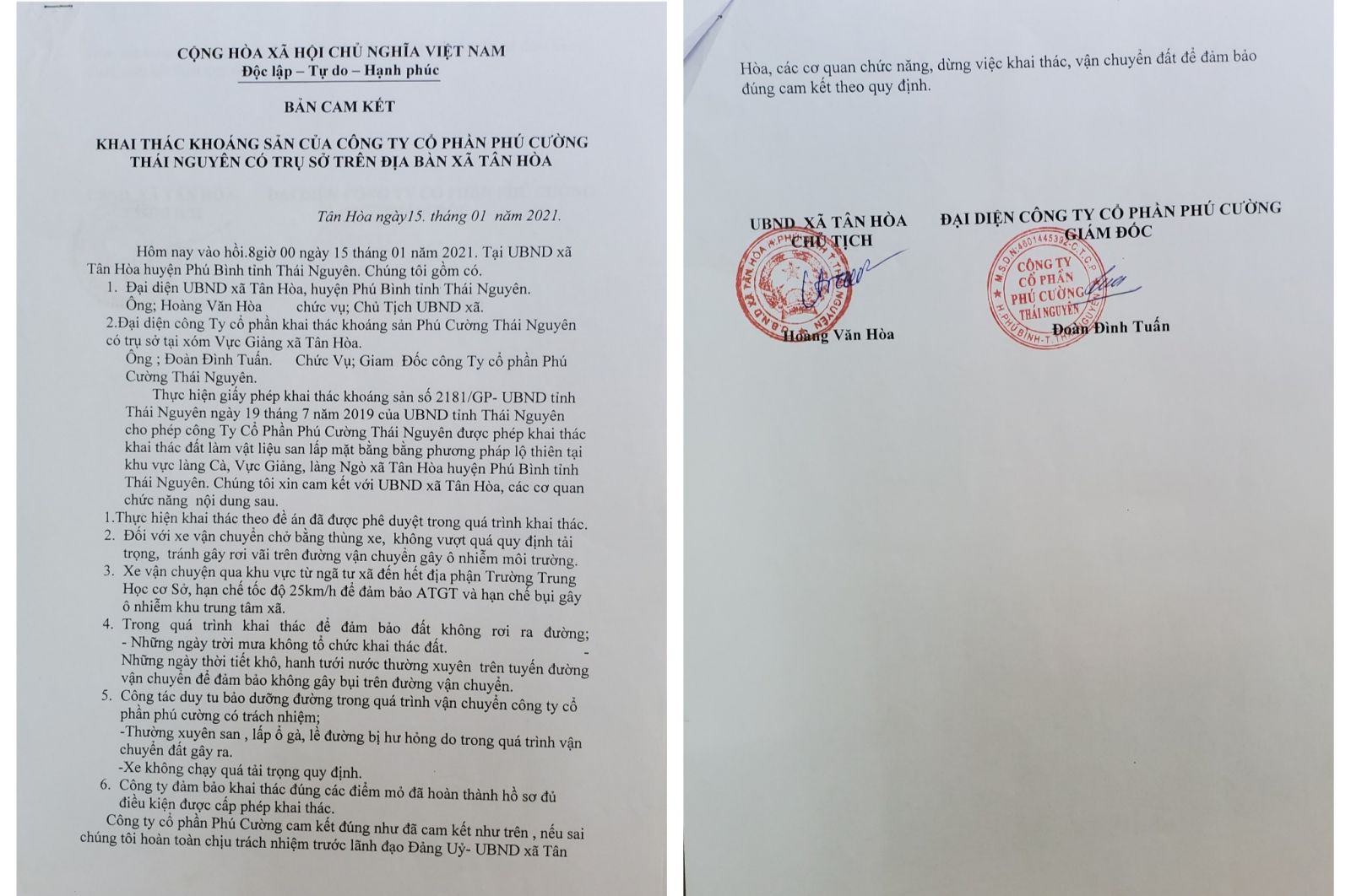 Theo như tài liệu thu thập, ngày 15/1/2021 Công ty Cổ phần Phú Cường Thái Nguyên đã ký bản cam kết với UBND xã Tân Hoà, các cơ quan chức năng, trong nội dung bản cam kết Công ty Cổ phần Phú Cường nêu rõ: “2. Đối với xe vận chuyển chở bằng thùng xe, không vượt quá quy định tải trọng, tránh gây rơi vãi trên đường vận chuyển gây ô nhiễm môi trường; 5. Công tác duy tu bảo dưỡng đường trong quá trình vận chuyển Công ty Cổ phần Phú Cường có trách nhiệm: Thường xuyên san, lấp ổ gà, lề đường bị hư hỏng do trong quá trình vận chuyển đất gây ra. Xe không chạy quá tải trọng quy định,… Công ty Cổ phần Phú Cường cam kết đúng như đã cam kết nêu trên, “Nếu sai chúng tôi hoàn toàn chịu trách nhiệm trước lãnh đạo Đảng uỷ - UBND xã Tân Hoà, các cơ quan chức năng, “dừng việc khai thác, vận chuyển đất” để đảm bảo đúng cam kết theo quy định”.”.
