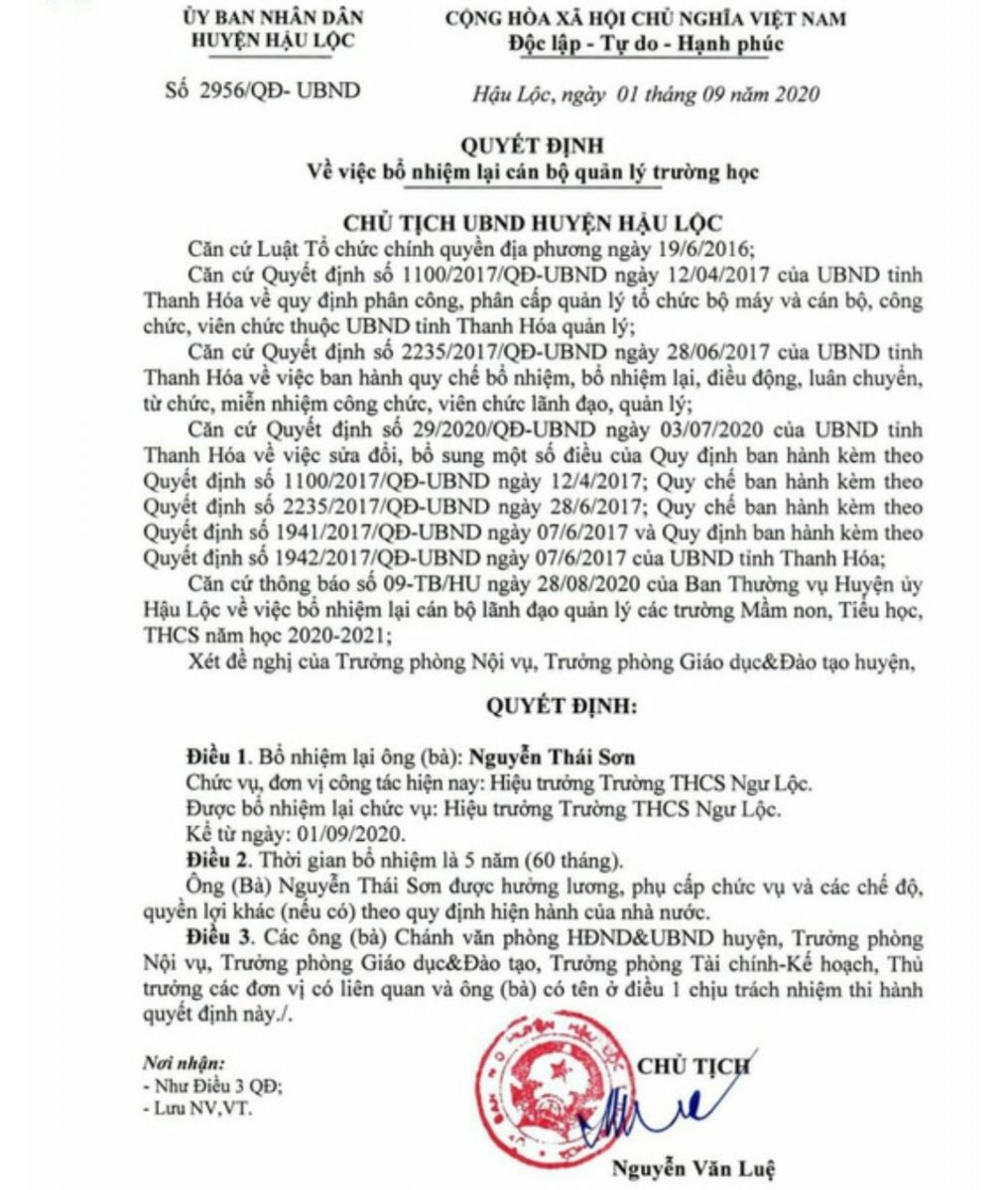 Quyết định bổ nhiệm lại Hiệu trưởng Trường THCS Ngư Lộc do ông Nguyễn Văn Luệ ký