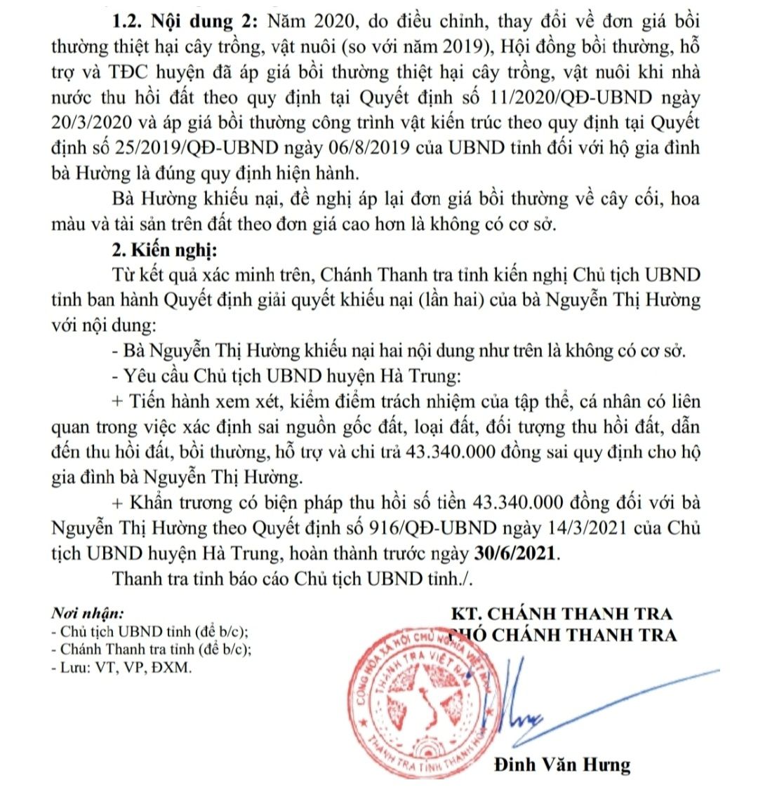 Như Pháp luật Quản lý tin ra ngày 30/7/2021 đã phản ánh: Trong quá trình thực hiện GPMB đường cao tốc Bắc - Nam đoạn đi qua địa phương này, Hội đồng đăng ký đất đai xã Hà Lĩnh đã xác định sai nguồn gốc, loại đất, đối tượng thu hồi đất đối với hộ bà Nguyễn Thị Hường, thôn Thọ Lộc, dẫn đến việc UBND huyện Hà Trung ban hành quyết định thu hồi đất, quyết định phương án bồi thường, hỗ trợ chi trả bồi thường không đúng quy định số tiền 43.340.000đ.