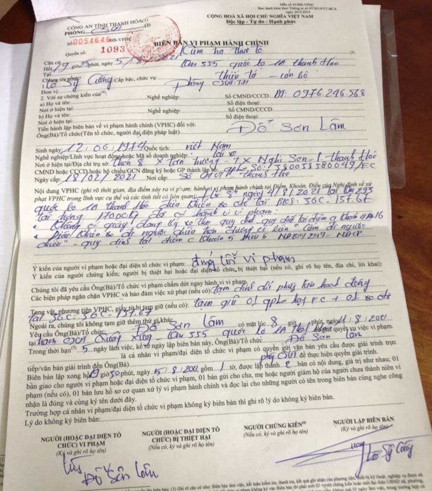 Cụ Thể: Đối với lái xe Đỗ Sơn Lâm đã bị Phòng CSGT Công an tỉnh Thanh Hóa lập biên bản vi phạm hành chính về hành vi vi phạm không có giấy đăng ký xe theo quy định. Được quy định tại điểm a khoản 4 Điều 16, Nghị định 100/2019/NĐ-CP và hành vi điều khiển xe đi ngược chiều trên đường có biển cấm đi ngược chiều, quy định tại điểm c khoản 5 Điều 5, Nghị định 100/2019/NĐ-CP. Đồng thời tạm đình chỉ phương tiện hoạt động; tạm giữ giấy phép lái xe và phương tiện vi phạm.