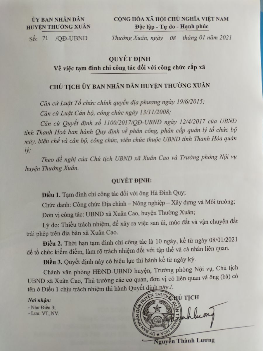 Theo đó, ngày 8 tháng 01 năm 2021, ông Nguyễn Thành Lương, Chủ tịch UBND huyện Thường Xuân đã ký quyết định số 71/QĐ-UBND về việc tạm đình chỉ công tác đối với công chức cấp xã.