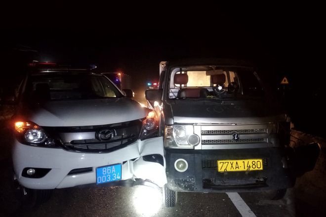 Nhận được tin báo, một tổ CSGT làm nhiệm vụ tuần tra kiểm soát trên đường đã phối hợp với chốt kiểm dịch cùng truy đuổi. Khi bị chặn lại, tài xế xe tải đã liều lĩnh thông thẳng vào xe CSGT khiến 2 phương tiện hư hỏng nặng.