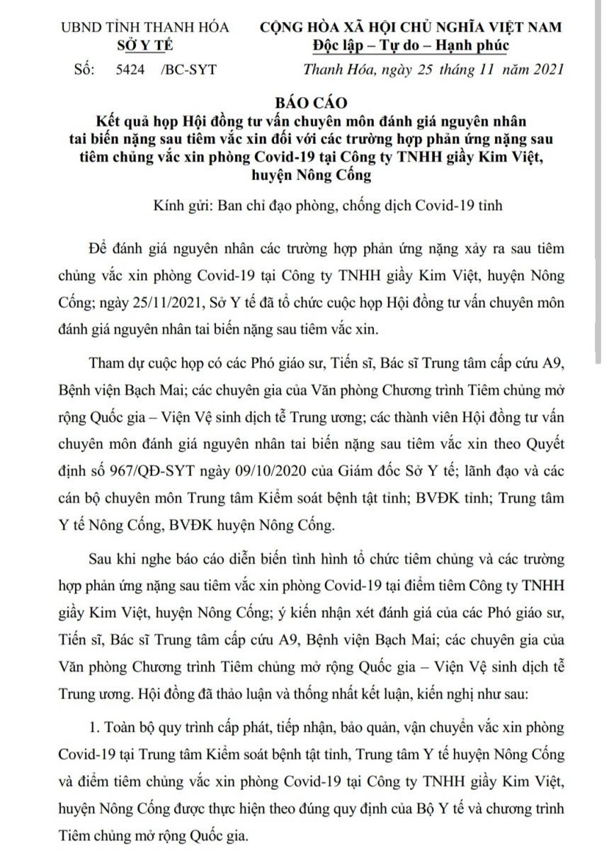 Báo cáo về của Sở Y tế Thanh Hoá về nguyên nhân tai biến nặng sau tiêm vắc xin phòng Covid-19 tại Công ty TNHH giầy Kim Việt.
