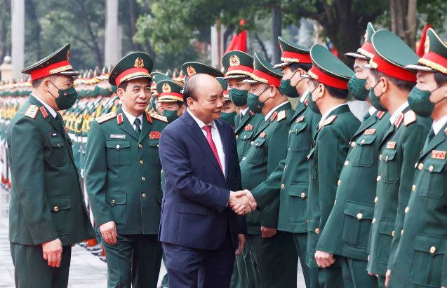 Ủy viên Bộ Chính trị, Chủ tịch nước Nguyễn Xuân Phúc với các tướng lĩnh Bộ Quốc phòng, sĩ quan chỉ huy Học viện Quốc phòng _Ảnh: TTXVN