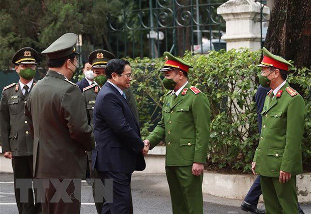 Thủ tướng Phạm Minh Chính đến thăm, kiểm tra công tác đảm bảo an ninh trật trự của Công an TP Hà Nội (Ảnh: TTXVN)