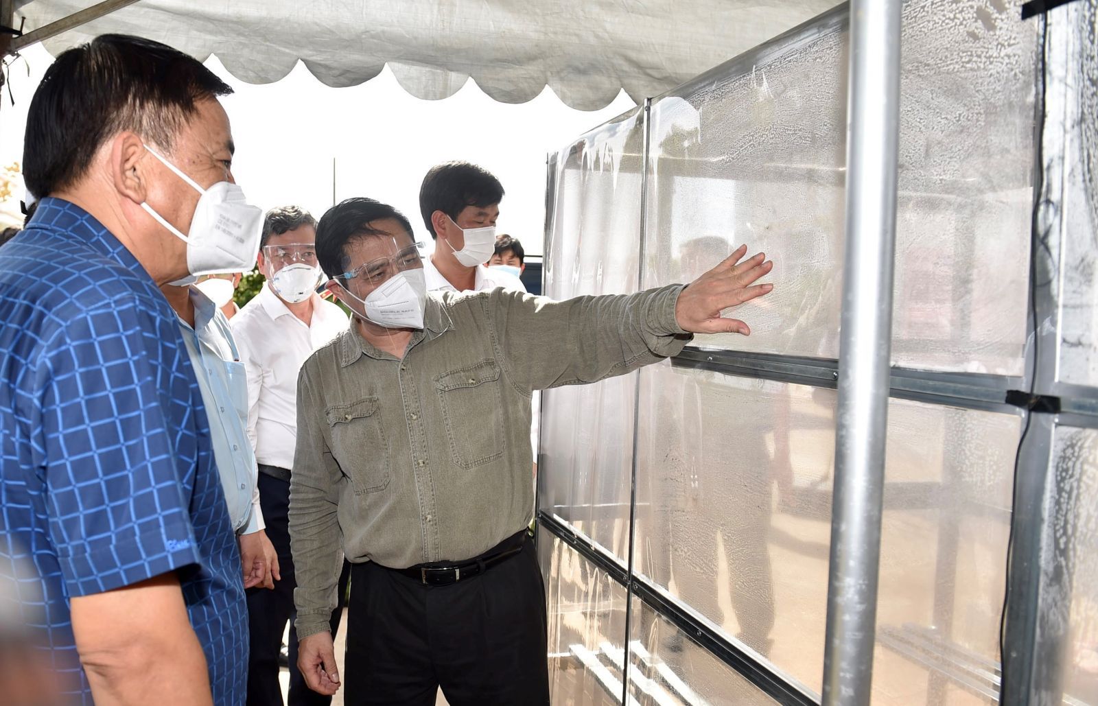 Thủ tướng Phạm Minh Chính đánh giá cao sáng kiến của xã Thạnh Phú, huyện Vĩnh Cửu, Đồng Nai đã chế tạo, sử dụng "máy xông hơi diệt virus, tăng cường sức đề kháng" kết hợp y học cổ truyền với hiện đại để chữa bệnh . Ông đề nghị đặt tên cho thiết bị này là "xông hơi COVID". Ảnh: VGP/Nhật Bắc.