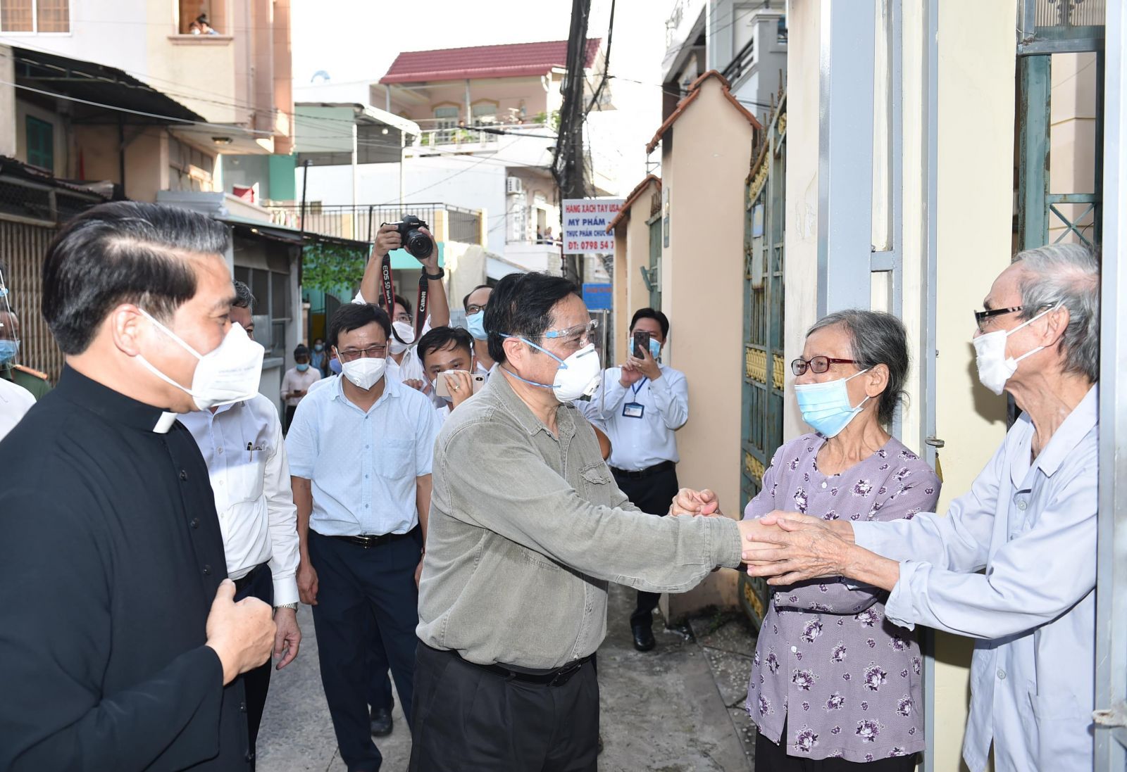 Thủ tướng động viên bà con giáo xứ Tân Mai, phường Tân Mai, TP. Biên Hòa, yên tâm thực hiện giãn cách. Ảnh: VGP/Nhật Bắc